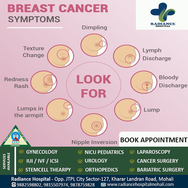 स्तन के आकार, माप या समरूपता में परिवर्तन निप्पल से स्राव (विशेषकर यदि वह रक्तयुक्त या पारदर्शी हो तथा दूध जैसा न हो) स्तन के आसपास की त्वचा में परिवर्तन, जैसे कि गड्ढे पड़ना, लाल होना या छिल जाना