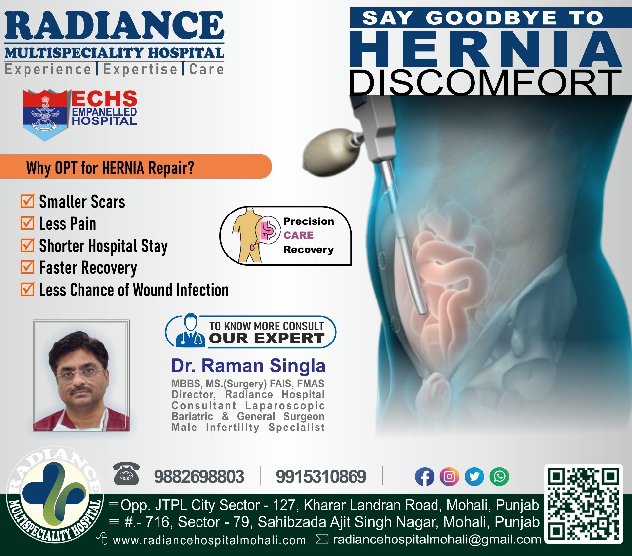 Dr. Raman Singla Director of Radiance Hospital specializes in hernia surgery and performs hernia surgery in Mohali(Punjab). He has treated many patients for hernia surgery throughout his more than 25 years of career. He is an expert in handling complications of surgery on the gall bladder.