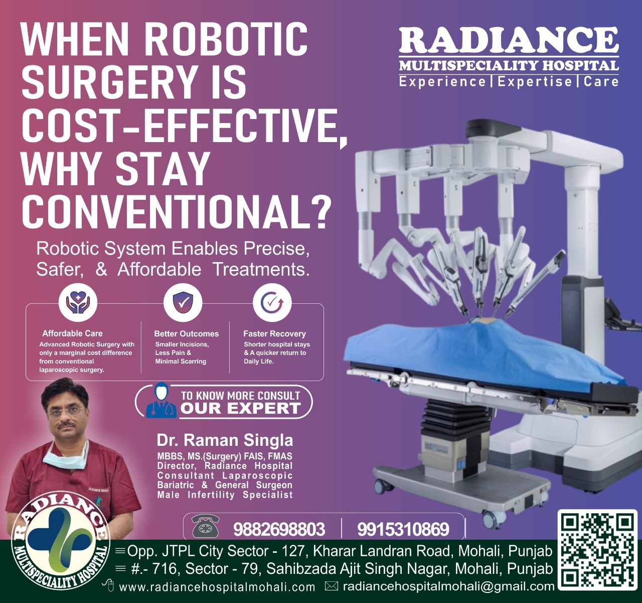 Robotic Surgery at Radiance Hospital MohaliRadiance Hospital Mohali offers robotic and minimally invasive laparoscopic surgery for various conditions, particularly abdominal diseases.