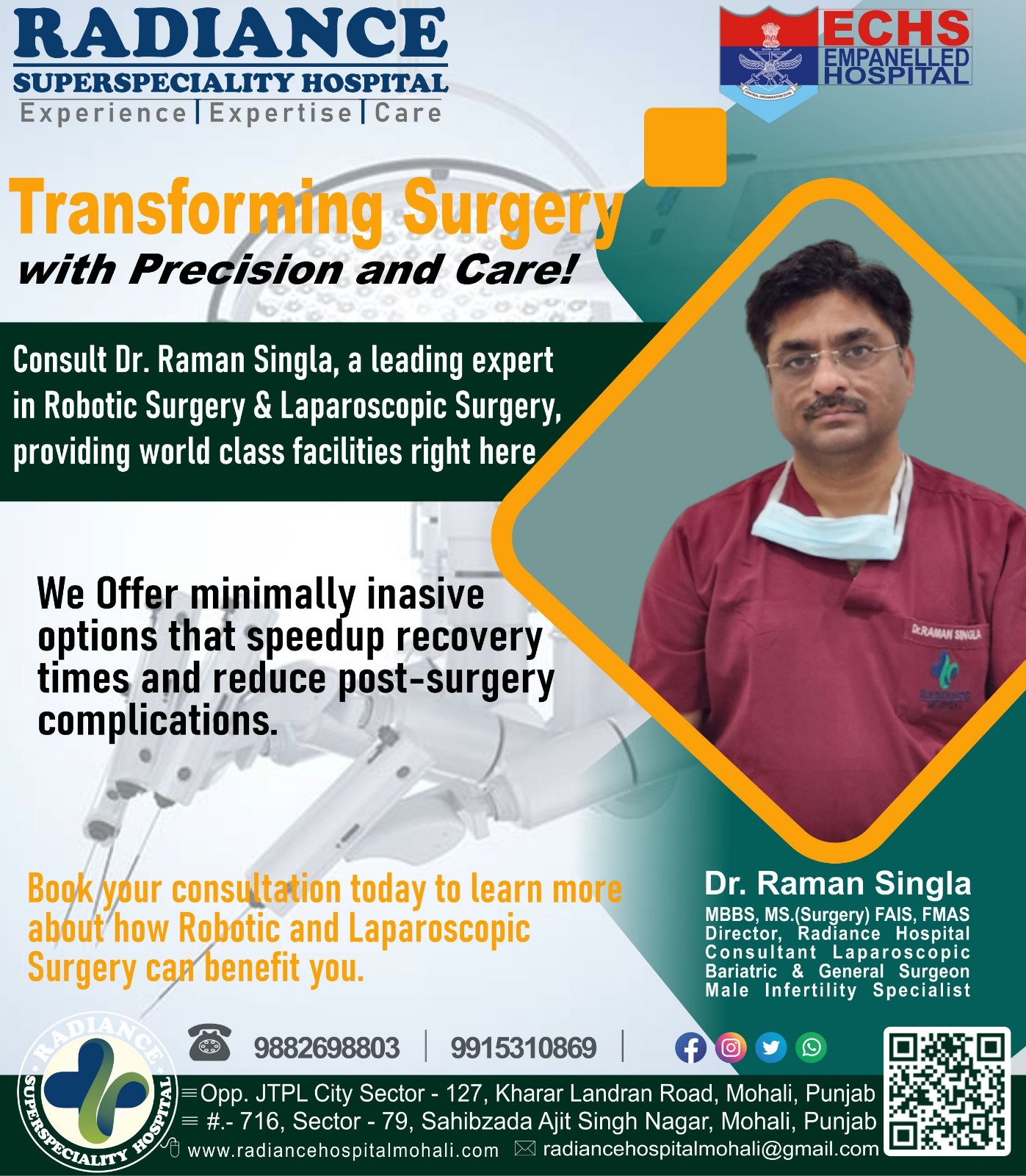 Radiance Multispeciality hospital in Mohali is a prominent center for gynecological surgery, known for advanced, minimally invasive techniques like laparoscopy, hysteroscopy, and robotic surgery, treating conditions from fibroids to cancers with specialists like Dr. Raman Singla and Dr. Rimmy Singla , offering comprehensive care for fertility, high-risk pregnancy, and women’s cancers with faster recovery and less pain.